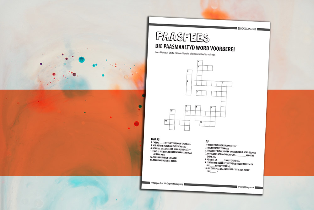In Matteus 26:17-30 lees ons van die instelling van die nagmaal. Lees dié gedeelte oor die voorbereiding van die Paasmaaltyd en voltooi dan die blokkiesraaisel.